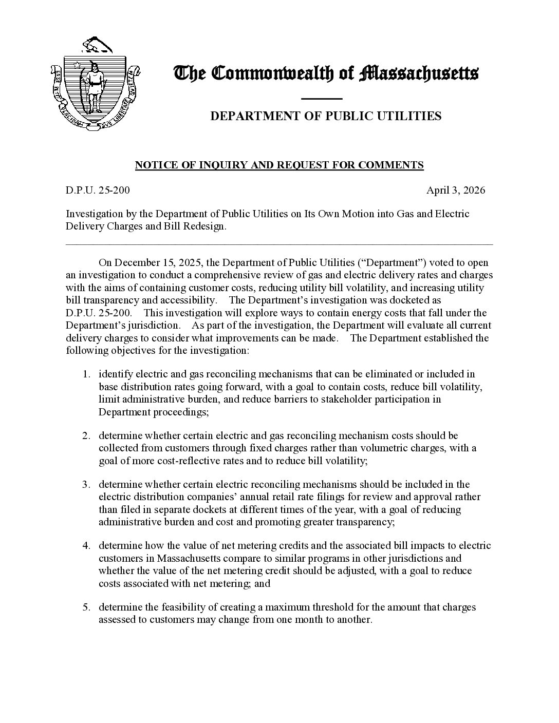 Department of Public Utilities- On behalf of NSTAR Electric Co., NSTAR Gas Co., & Eversource Gas Co. of MA, each d/b/a Eversource Energy- Notice of Inquiry and Request for CommentsApril 7, 2026