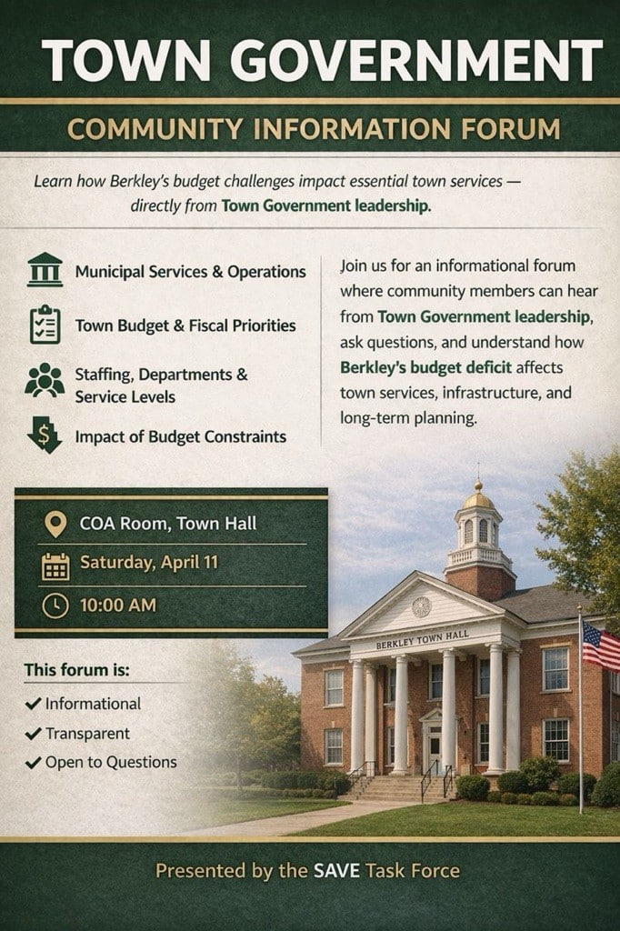 Welcome to Berkley, Massachusetts Berkley, a charming town in Bristol County, Massachusetts, offers a tranquil setting with a rich history, friendly residents, and a variety of recreational opportunities. About Berkley Job Opportunities Any Category Accountant Agriculture Commission Animal Control Annual Reports Board of Assessors Board of Health Board of Registrars Board of Selectmen Building Inspector Cable TV Advisory Committee Capital Improvement Committee Celebration Committee Cemetery Commissioners Common Committee Conservation Commission Council on Aging Cultural Council Election Finance Committee Fiscal Task Force Highway Department Historical Commission Job Opportunities Library Board of Trustees Library Building Committee Master Plan Committee MSBA Building Committee Planning Board School Committee School Department Soil Conservation Board Tax Collector Town Clerk Office Town Moderator Town News Transfer Station / Recycling Treasurer Tree Warden Veterans' Agent Zoning Board of Appeals Latest News Public Forum – Override & General GovernmentApril 9, 2026Department of Public Utilities- On behalf of NSTAR Electric Co., NSTAR Gas Co., & Eversource Gas Co. of MA, each d/b/a Eversource Energy- Notice of Inquiry and Request for CommentsApril 7, 2026 Caregiver Support Group: Thursday, April 23, 2026 at 11:00amApril 1, 2026 View All News Quick Links Agendas, Minutes & Documents Online Payments Property Database Budget Microsite Contact Information Council on Aging Transfer Station Recorded Meetings Upcoming Events Apr 9 6:00 pm Finance Committee Apr 9 6:00 pm Planning Board-CANCELED Apr 11 10:00 am SAVE Task Force Community Information Forum Apr 13 6:00 pm Berkley School Committee Apr 14 5:30 pm SAV- Prev. Fiscal Sustainability Task Force View Calendar Berkley Public Library MA Community Focused Public Schools Fire & Rescue Police Department Public Library Subscribe via email to our news Type your email… Subscribe